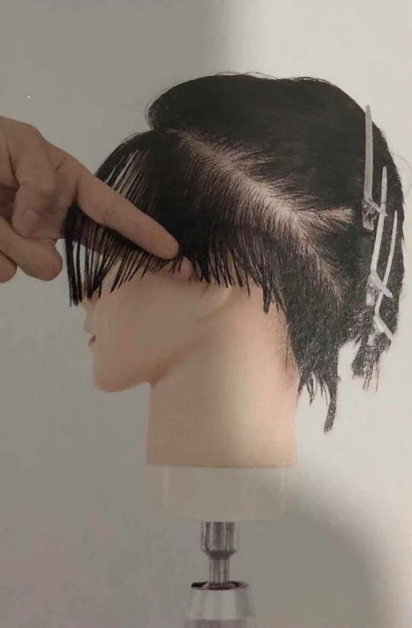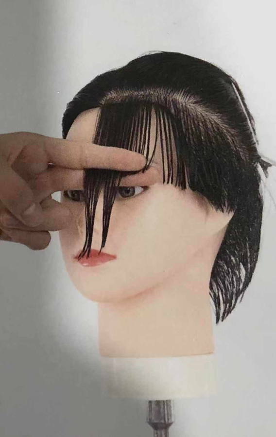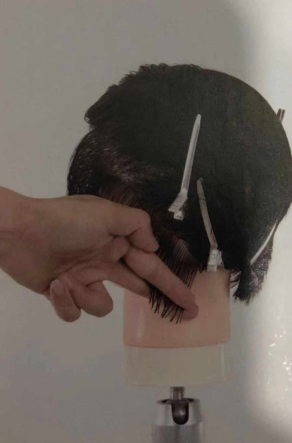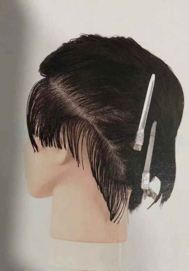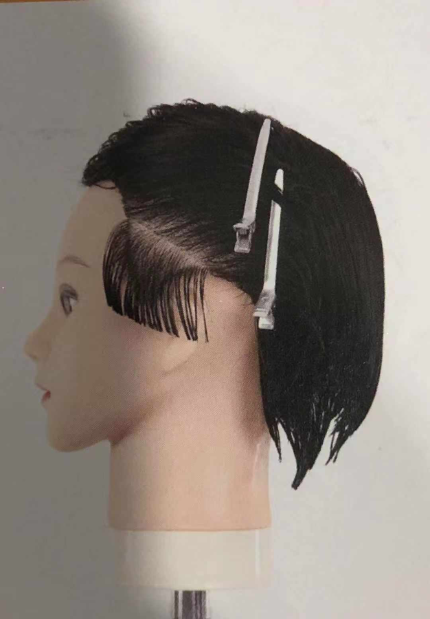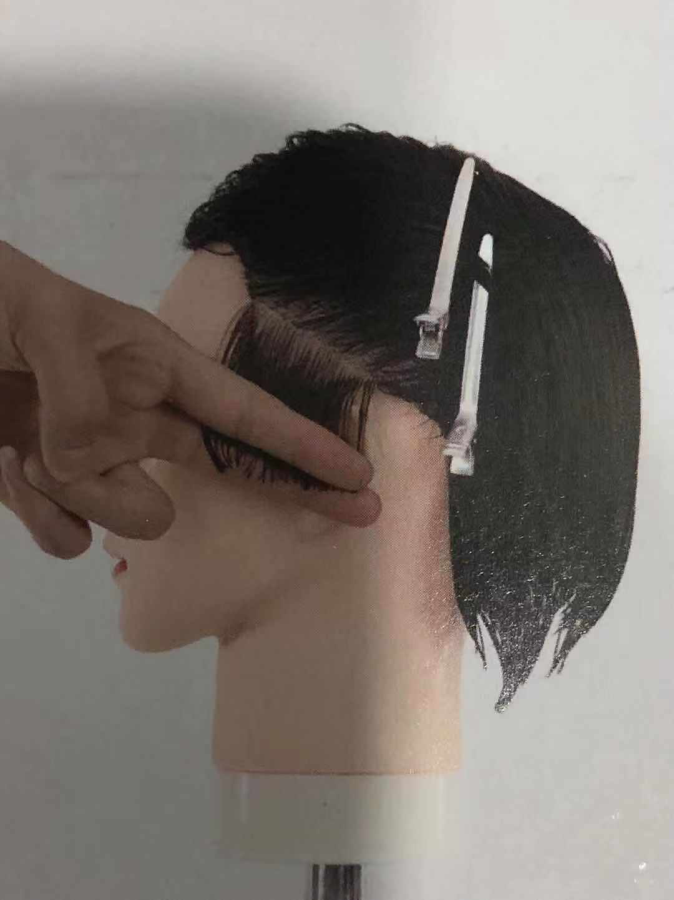 1. 修剪剪鬓角处发片时,手指斜放指尖向下,做到剪切线与分界线平行。