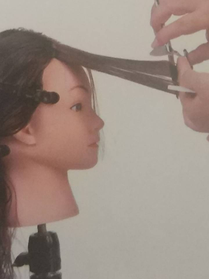 将刘海区上面的发片取下,以修剪完的下面发片为导线进行修剪。注意修剪时刀口倾斜45°,采用移动剪的方式修剪刘海。