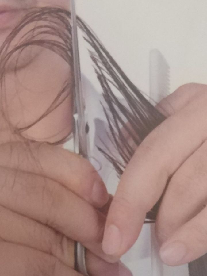 注意修剪发梢时,手指与分份线保持平行,剪刀垂直地面,由下至上进行修剪。