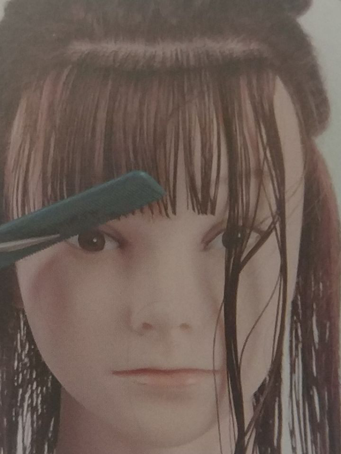 将梳子水平摆放,下位至眼睛上方,切口与梳子保持平行进行修剪。