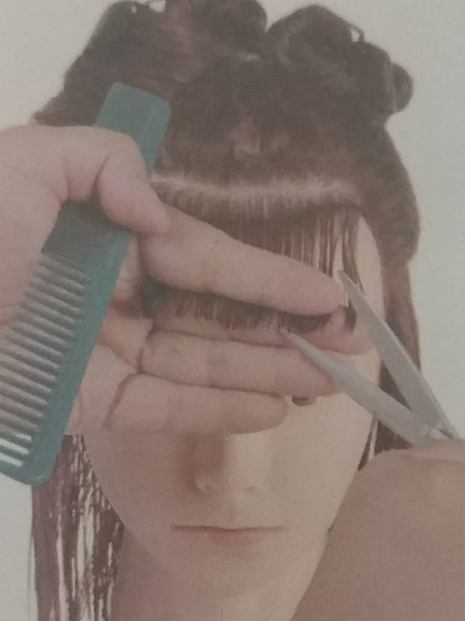 同理,将梳子倾斜135°,梳子与切口平行修剪刘海区左侧的发束。